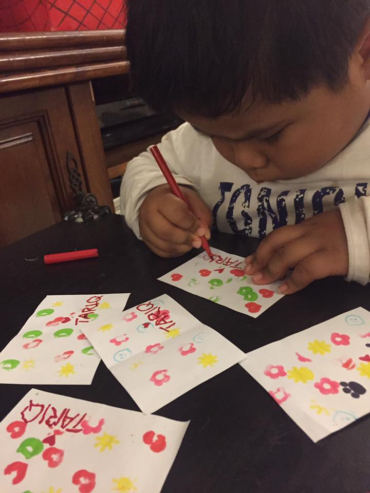 | Tariq working hard preparing his personalized Teacher's Day card for every of his Aunties. Good job Tariq! |